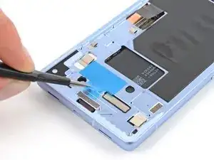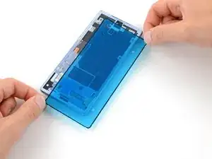 Используйте пинцет с притуплёнными концами или пальцы, чтобы отклеить и снять квадратный кусочек клея возле выреза для батареи.