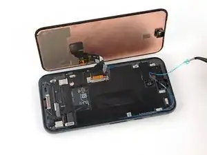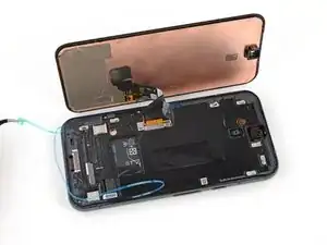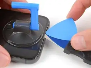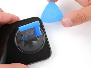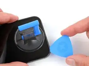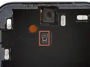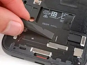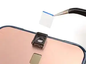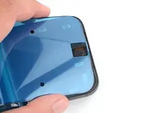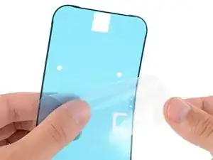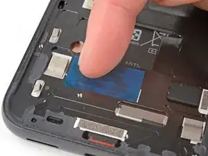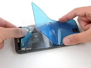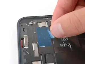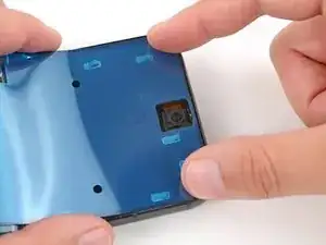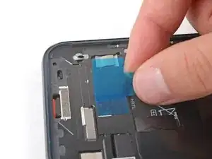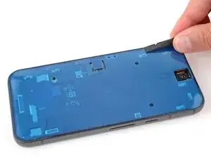 Отклейте и удалите синюю защитную плёнку с квадратного участка клея на раме, расположенного чуть ниже выреза под аккумулятор.