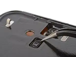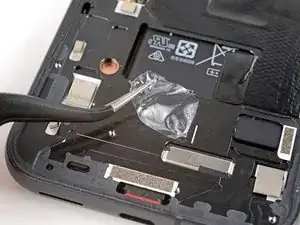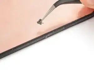 Используйте пинцет и лопатку, чтобы соскрести и удалить остатки клея под вырезом аккумулятора.