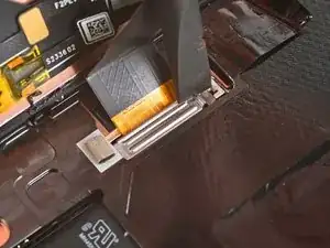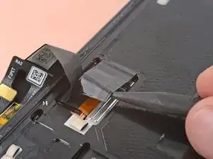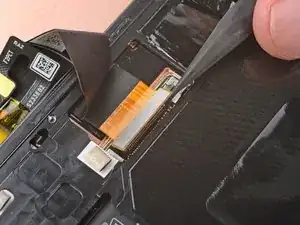 Вставьте наконечник лопатки или чистый ноготь под верхний край контактного разъёма кабеля дисплея и подденьте его прямо вверх, чтобы отключить.