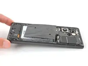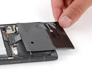 Осторожно отогните графитовый лист на аккумуляторе через верхний край телефона.
