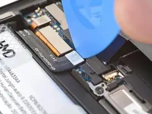 Вставьте кончик медиатора под верхнюю кромку нажимного разъёма аккумулятора и подденьте, чтобы отсоединить его.