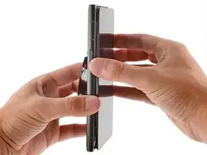 Свободной рукой используйте инструмент для извлечения SIM‑лотка (или другой похожий предмет, например распрямлённую скрепку), чтобы аккуратно нажать на экран через вырез в левом нижнем углу рамки — это должно отделить экран, и он упадёт на рабочую поверхность.