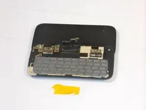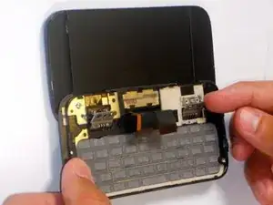 Используя лопатку или другой тонкий инструмент, осторожно приподнимите ZIF-разъемы, как показано. Это позволит черным лентам отсоединиться от клавиатуры.