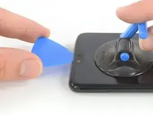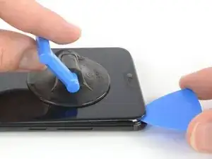 Поднимите присоску и вставьте кончик медиатора для открытия под дисплей в месте расположения слухового динамика.