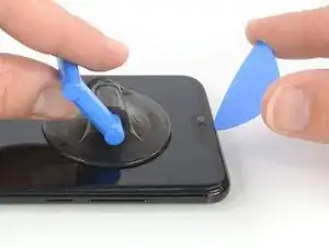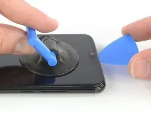 Поднимите присоску и вставьте кончик второго медиатора для открытия под дисплей в месте расположения слухового динамика.