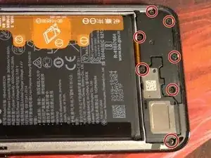Снимите 6 винтов, удерживающих динамик и пластиковую крышку, отмеченную на первом изображении