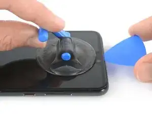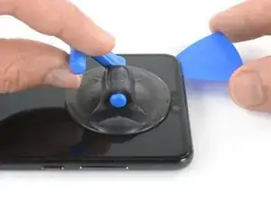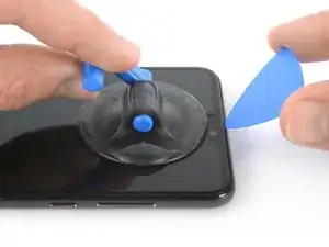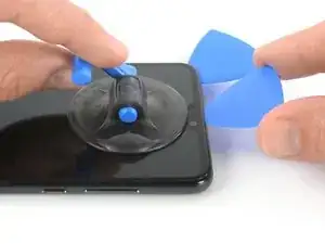Потяните присоску вверх и вставьте медиатор в зазор между стеклом дисплея и пластиковым ободом. Начните разрезать клей, проводя медиатором к верхнему левому углу.