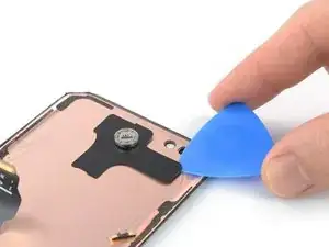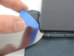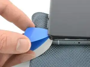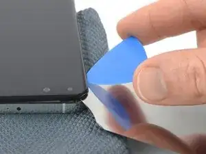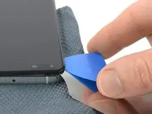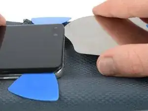 Вставьте открывающую пластину в зазор между задним стеклом и рамкой в нижнем левом углу телефона, чтобы клей не сомкнулся снова.