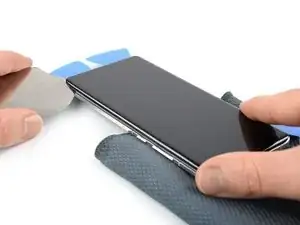Проведите iFlex вдоль левого края вашего Huawei P40 Pro, чтобы разрезать клей.