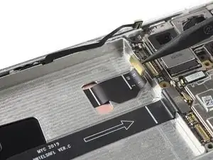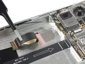 Шлейф дисплея приклеен к средней рамке лёгким клеем. Используйте пинцет или пальцы, чтобы аккуратно отодрать его.
