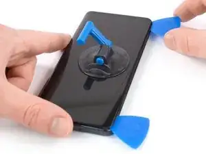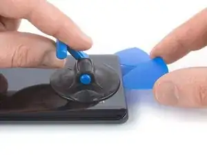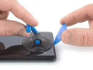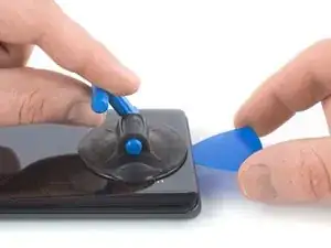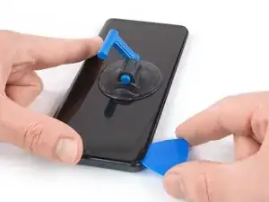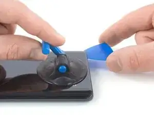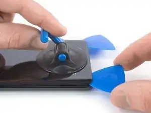 Поднимите присоску вверх и вставьте лезвие для вскрытия в зазор между стеклом дисплея и пластиковой рамкой.