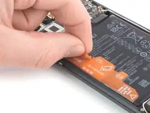 Оторвите оранжевую клейкую ленту, помеченную цифрой 2, от батареи. Оранжевая лента порвётся по небольшой перфорированной линии.