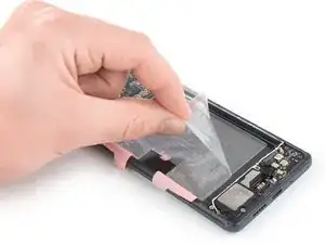 Лучший способ закрепить новый экран — использовать лист двусторонней ленты, обрезанный по размеру. Нанесите ленту на тыльную сторону экрана, затем аккуратно пропустите кабель дисплея через рамку. Выровняйте экран и прижмите его на место.