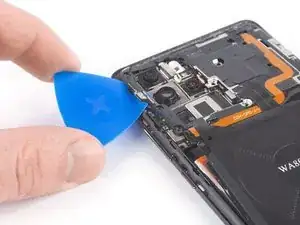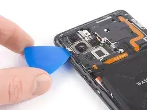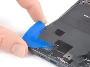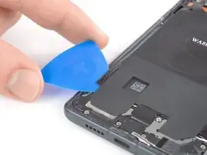 Просуньте медиатор под чёрный клей внизу справа катушки беспроводной зарядки.