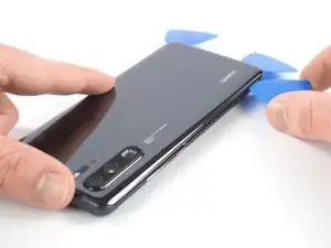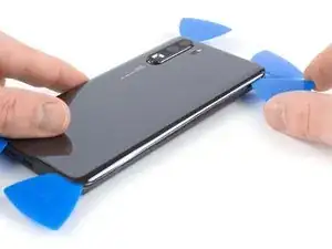 Проведите медиатором вдоль верхнего края телефона, чтобы разрезать клей.