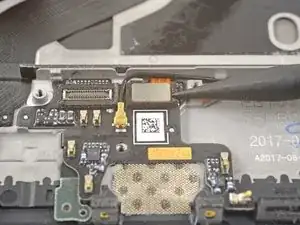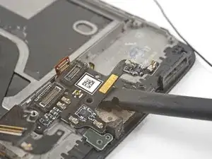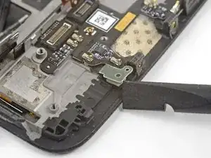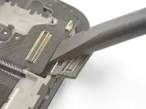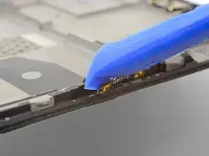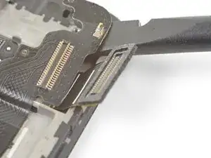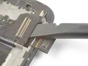 Вставьте плоский конец лопатки под разъём шлейфа соединения дисплея, рядом с местом его соединения с разъёмом дисплея в нижнем левом углу рамки.
