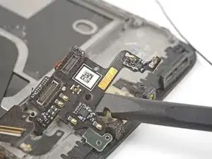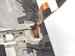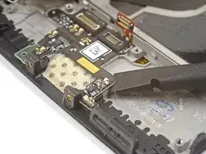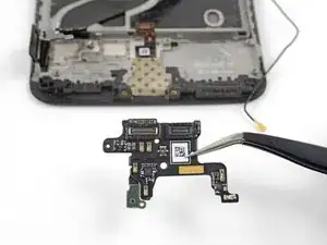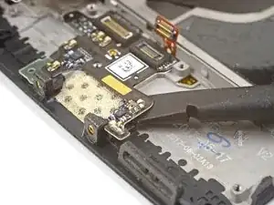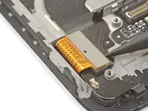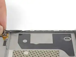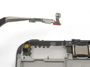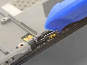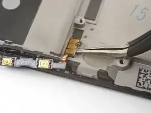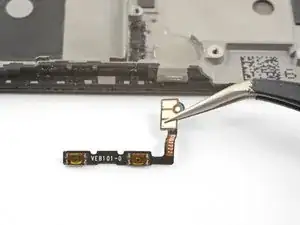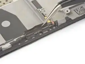 Сожмите кончики пинцета и вставьте наконечник под контактную площадку платы кнопок громкости в верхнем правом краю рамки.