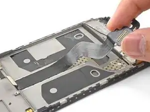 Схватите ослабленный конец шлейфа соединения дисплея пальцами и потяните вверх, извлекая шлейф из рамки.