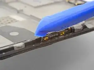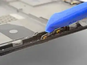 Используйте край инструмента для вскрытия, чтобы аккуратно поддеть плату кнопок громкости от рамки.