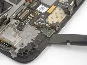 Вставьте наконечник медиатора для вскрытия между мотором вибрации и рамкой и надавите вниз, чтобы ослабить мотор вибрации в его посадочном месте.