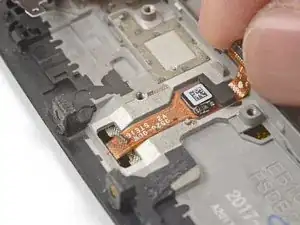 Когда сканер отпечатков пальцев освободится из посадочного места, аккуратно протяните его гибкий кабель через вырез, наружу через переднюю часть дисплея.