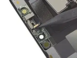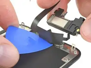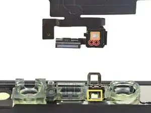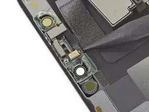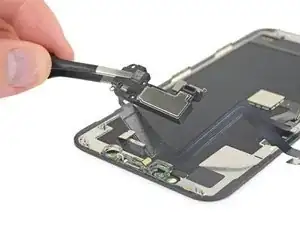 Комбинированный динамик для разговора и блок датчиков, прикреплённый к задней стороне дисплея, с завода спарен с конкретным iPhone, поэтому при любой замене дисплея вы должны перенести его со старого дисплея на новый. Он содержит подсветку-осветитель, которая является частью биометрической функции Face ID. Если он повреждён или заменён, Face ID перестанет работать, поэтому проявляйте особую осторожность, чтобы не повредить эти компоненты в ходе процедуры. В случае повреждения восстановить работу Face ID сможет только Apple или авторизованный техник Apple.