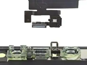 Затем положите датчик освещённости на рассеивающую полоску. Вам потребуется удерживать датчик в положении при установке винтов, крепящих узел динамика/датчика. После затяжки винтов датчик зафиксируется и будет работать нормально.
