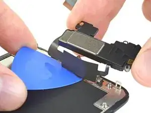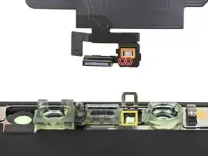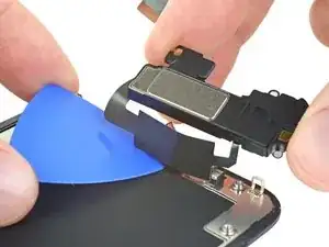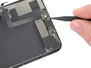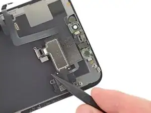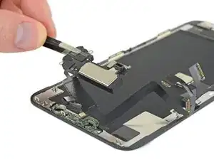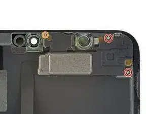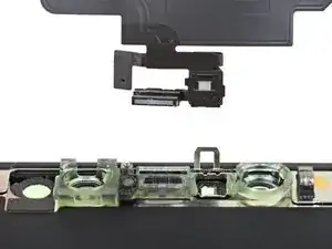 Комбинированный динамик-слуховой прибор + сборка датчиков, прикреплённая к задней части дисплея, с завода привязана к конкретному iPhone, поэтому при любой замене дисплея вы должны перенести её со старого дисплея на новый. Она содержит подсветку-заливатель, которая является частью биометрической функции Face ID. Если она будет повреждена или заменена, Face ID перестанет работать, поэтому проявляйте особую осторожность, чтобы не повредить эти компоненты во время процедуры. В случае повреждения только Apple или уполномоченный специалист Apple сможет восстановить работу Face ID.