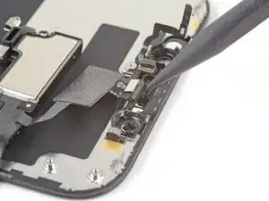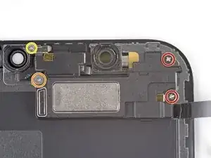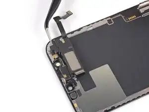Комбинированный динамик разговорного громкоговорителя и блок датчиков, прикреплённый к тыльной стороне дисплея, с завода откалиброван и привязан к конкретному iPhone, поэтому при любой замене дисплея его необходимо перенести со старого дисплея на новый. Он содержит подсветку (flood illuminator), которая является частью биометрической функции Face ID. Если этот компонент повреждён или заменён, Face ID перестанет работать, поэтому проявляйте особую осторожность, чтобы не повредить эти элементы в процессе. В случае повреждения восстановить работу Face ID может только Apple или авторизованный специалист Apple.