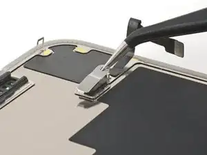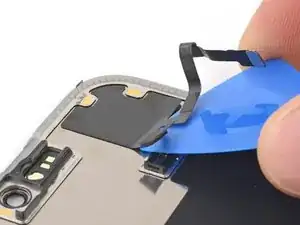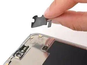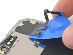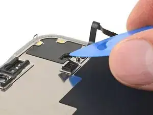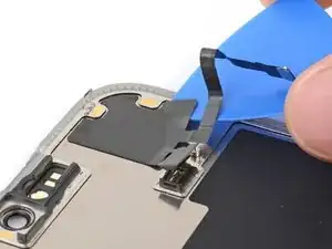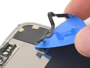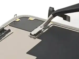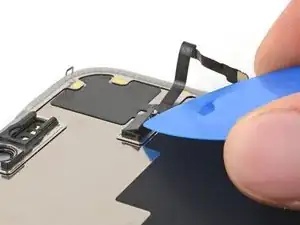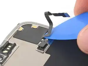 Используйте пинцет или пальцы, чтобы взять и сдвинуть крышку основной платы вниз по корпусу телефона, чтобы освободить кабель датчика.