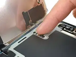 Заправьте язычок крышки коннектора дисплея в вырез рамы и уложите крышку на место.