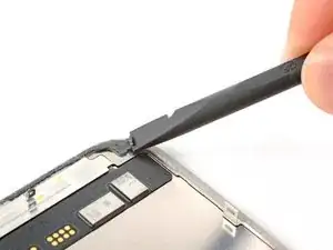Медленно проколите медиатор под кабель датчика освещённости, начиная под разъёмом внизу и двигаясь вверх, пока кабель не освободится от экрана.
