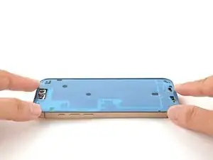 Аккуратно совместите обнажённый край клейкой ленты с соответствующим краем рамы вашего iPhone.