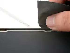 Используя безворсовую салфетку (или кофейный фильтр) и изопропиловый спирт высокой концентрации (>90%), очистите участки рамы и экрана, где вы удалили старый клей.
