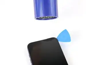 Проведите лопатку вверх по правому краю, чтобы отделить клей и освободить защёлку, остановившись прямо перед кнопкой увеличения громкости.