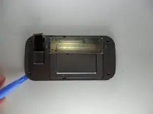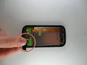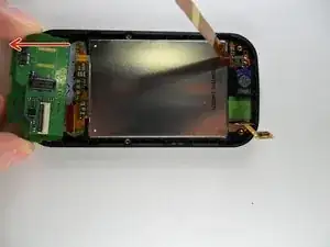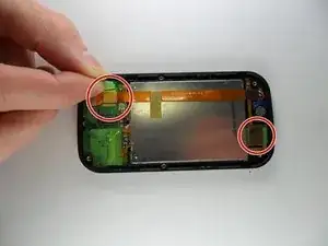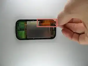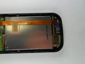 После снятия слайд-панели станет видна задняя часть экрана. Сначала отсоедините шлейф разъёма, прикреплённый внизу телефона. Как и первый конец, этот конец также отсоединяется путём поддевания и отщелкивания.