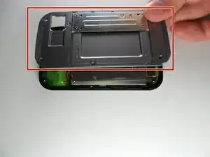Когда серебристый ЖК-дисплей немного приподнят, сдвиньте нижнюю половину зелёной платки с телефона, потянув её вниз.