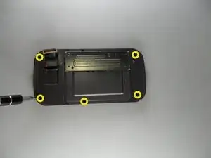 Используя подходящую биту из набора 64 биты, выкрутите маленькие чёрные винты, отмеченные жёлтым кружком, которые фиксируют заднюю крышку и внутренние компоненты.
