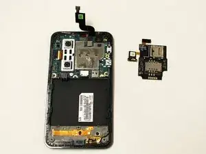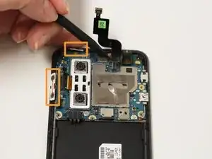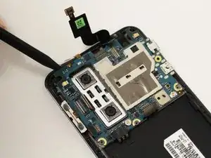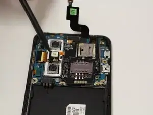 С помощью лопатки или пластиковой лопатки аккуратно отсоедините ленточный кабель, подключенный к чёрной плате SIM-карты.