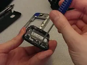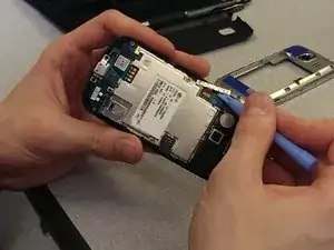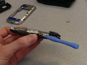 Используйте синий пластиковый инструмент для вскрытия, чтобы отделить заднюю рамку от остальной части телефона.