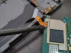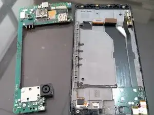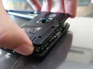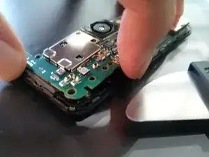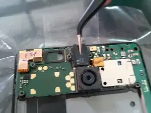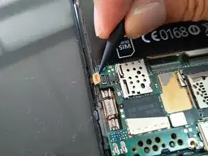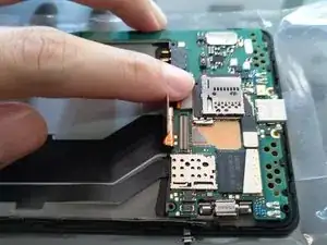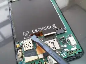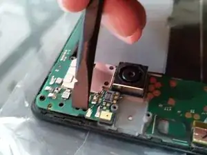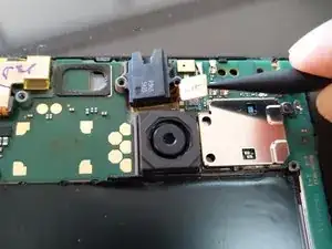 Начните работу с верхнего правого угла телефона. Снимите материнскую плату с защёлки вручную или используйте ломаную лопатку, чтобы немного поддеть и облегчить процесс.