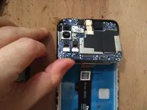 После снятия чёрной пластиковой крышки отключите кабель, удерживающий заднюю панель