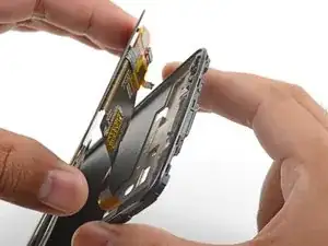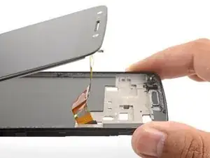 Возьмите телефон вблизи верхнего края и медленно отделяйте экран и кабель дисплея от рамы.