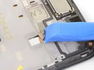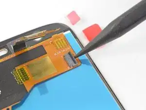 Используйте лопатку, чтобы поднять фиксирующий язычок ZIF-разъёма кабеля дигитайзера, расположенного на задней стороне экрана в верхнем правом углу.