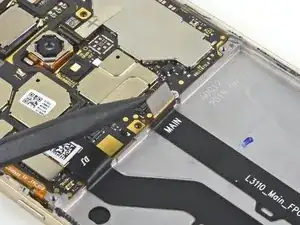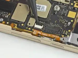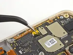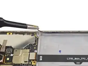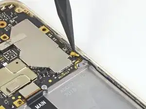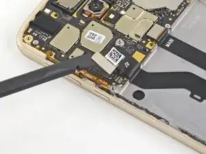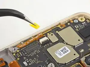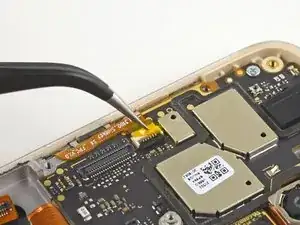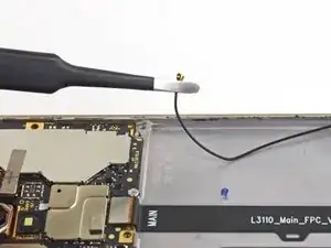 Дочерняя плата всё ещё прикреплена к антенной, поэтому поднимайте дочернюю плату с левой стороны телефона и переворачивайте её через правую сторону, чтобы не вырвать антенный кабель.