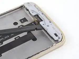 Используйте острый конец лопатки, чтобы приподнять чёрный фиксатора на разъёме кабеля кнопки громкости.