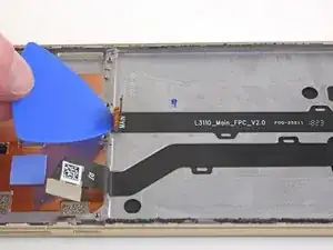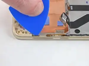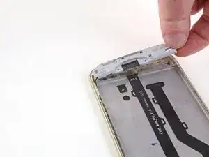 Проведите открывающей пластиной под кабелем кнопки громкости, чтобы разрезать клей и освободить кабель от материнской платы.