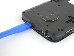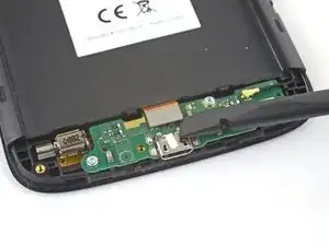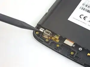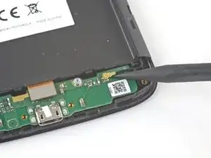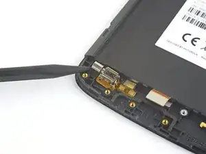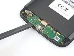 Вставьте плоский конец лопатки в зазор под дочерней платой и слева от разъема зарядки.
