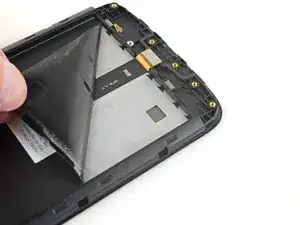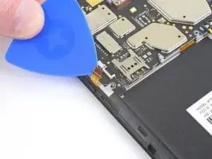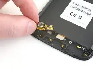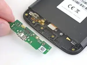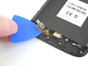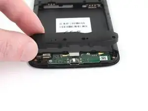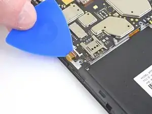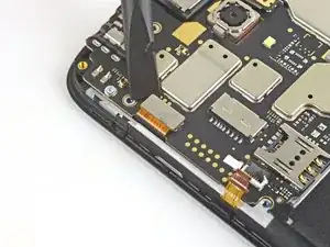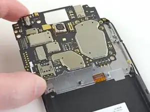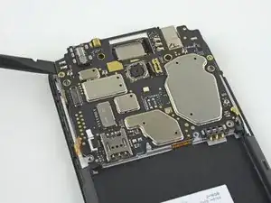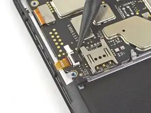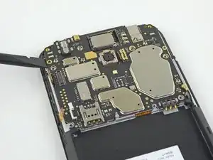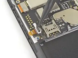 Нижняя сторона материнской платы всё ещё соединена с телефоном через гибкий кабель дочерней платы возле нижнего края. Приподнимание материнской платы должно её отсоединить. Если это не происходит, используйте плоский конец лопатки рядом с разъёмом, чтобы отсоединить его.